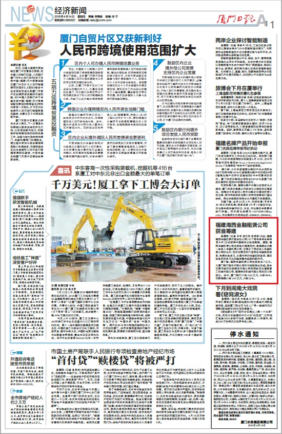 廈門晚報(bào):海西金融租賃公司籌建 廈門銀行為控股股東