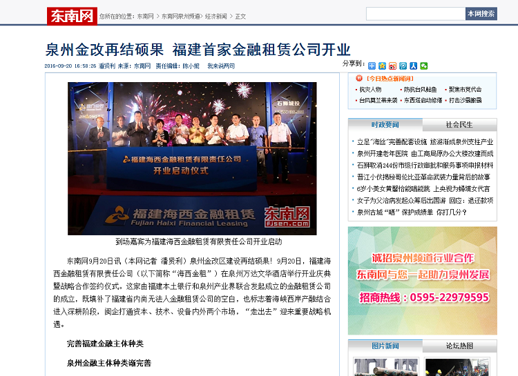 泉州金改再結(jié)碩果 福建首家金融租賃公司開業(yè)