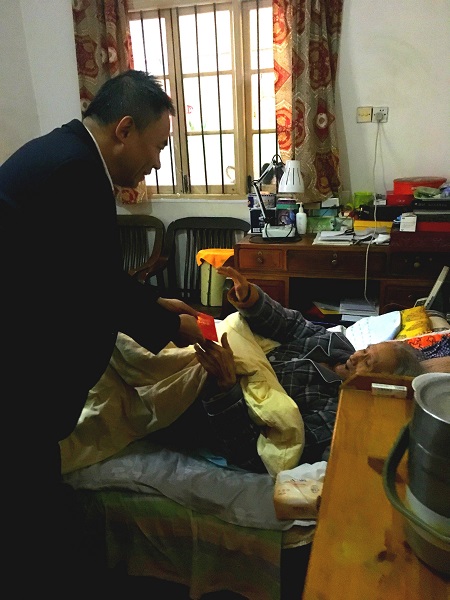 “您老身體恢復(fù)得怎么樣?”在原東湖村退休村主任蘇齊杰家中,朱丹監(jiān)事長與其親切交談。蘇美清書記介紹,老主任今年72歲,于2017年初發(fā)現(xiàn)患晚期肺癌,現(xiàn)經(jīng)常進(jìn)入醫(yī)院治療,花費(fèi)較大,屬因病致貧的困難戶。朱丹監(jiān)事長祝他早日恢復(fù)健康,并代表公司給其全家拜個(gè)早年。