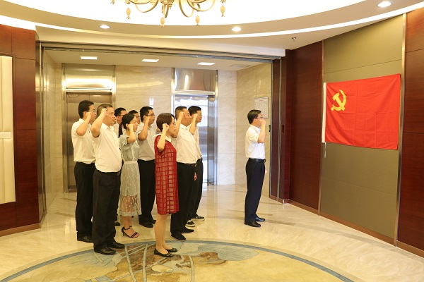 “我志愿加入中國共產(chǎn)黨,擁護黨的綱領(lǐng),遵守黨的章程……”在“七一”建黨97周年之際,公司全體黨員佩戴黨徽,舉起右拳,面對黨旗,在黨委書記潘青松的帶領(lǐng)下莊嚴(yán)宣誓。每一句誓詞都洪亮有聲、鏗鏘有力,表達了每一位黨員牢記使命、永葆本色、不忘初心、繼續(xù)前進,為黨的事業(yè)奮斗終生的決心。