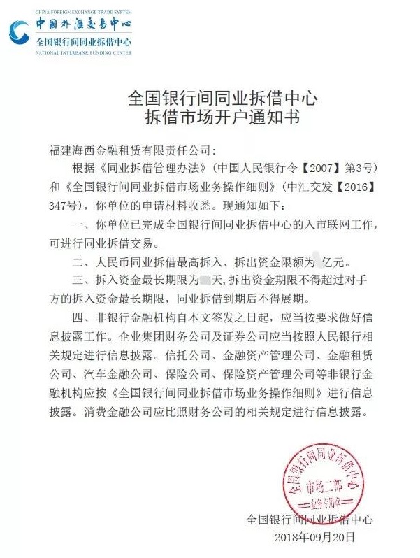 我公司提前籌劃部署,及早與全國同業(yè)拆借中心溝通,充分做好相關(guān)準(zhǔn)備工作,在成立兩周年之際,便獲得全國銀行間拆借中心的聯(lián)網(wǎng)批復(fù),正式獲準(zhǔn)進(jìn)入全國銀行間拆借市場。目前,我司已完成全部聯(lián)網(wǎng)接入工作,已具備線上拆借條件。